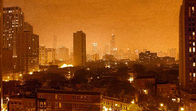 Where I got the idea to set the city on fire I have no idea. In any case, I had to find flames. I have a library of photos I use for compositing purposes, so I searched and opened those files, and began placing them throughout the city. This layer of fire to the right was set to "Screen" so that only the lighter colors showed once placed above the city photo.
